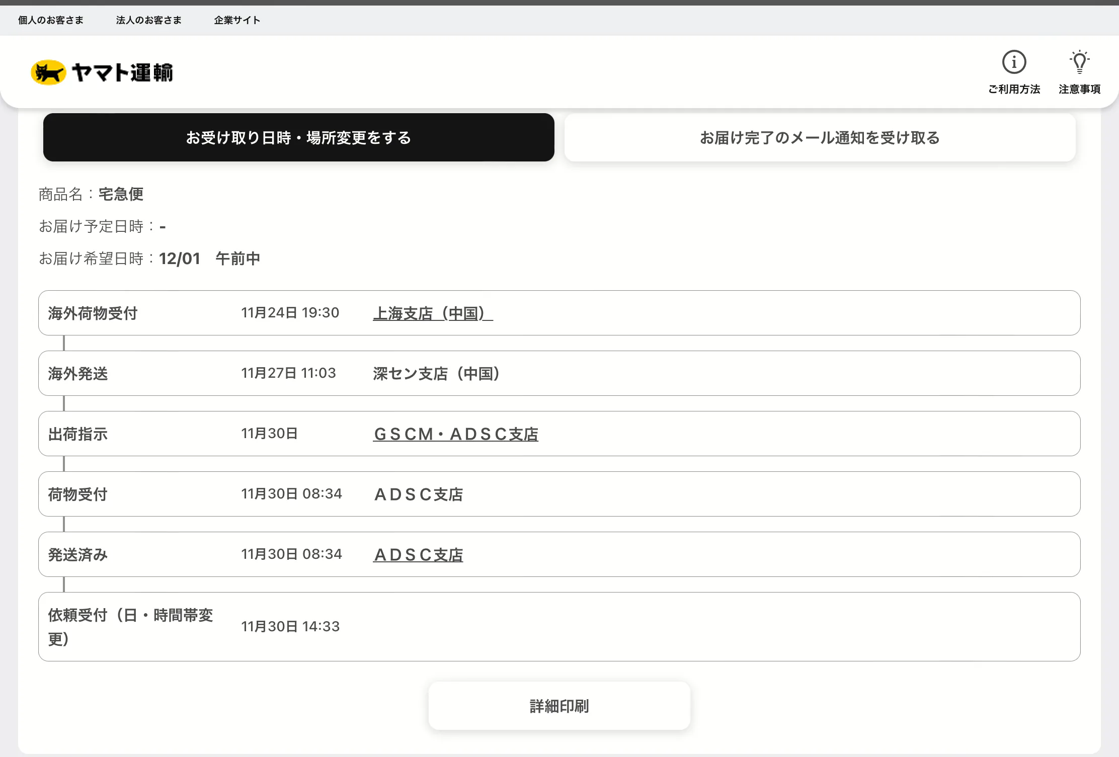 - Credit card charged, status updated to shipped. Picked up by Yamato Transport at the Shanghai branch (China).